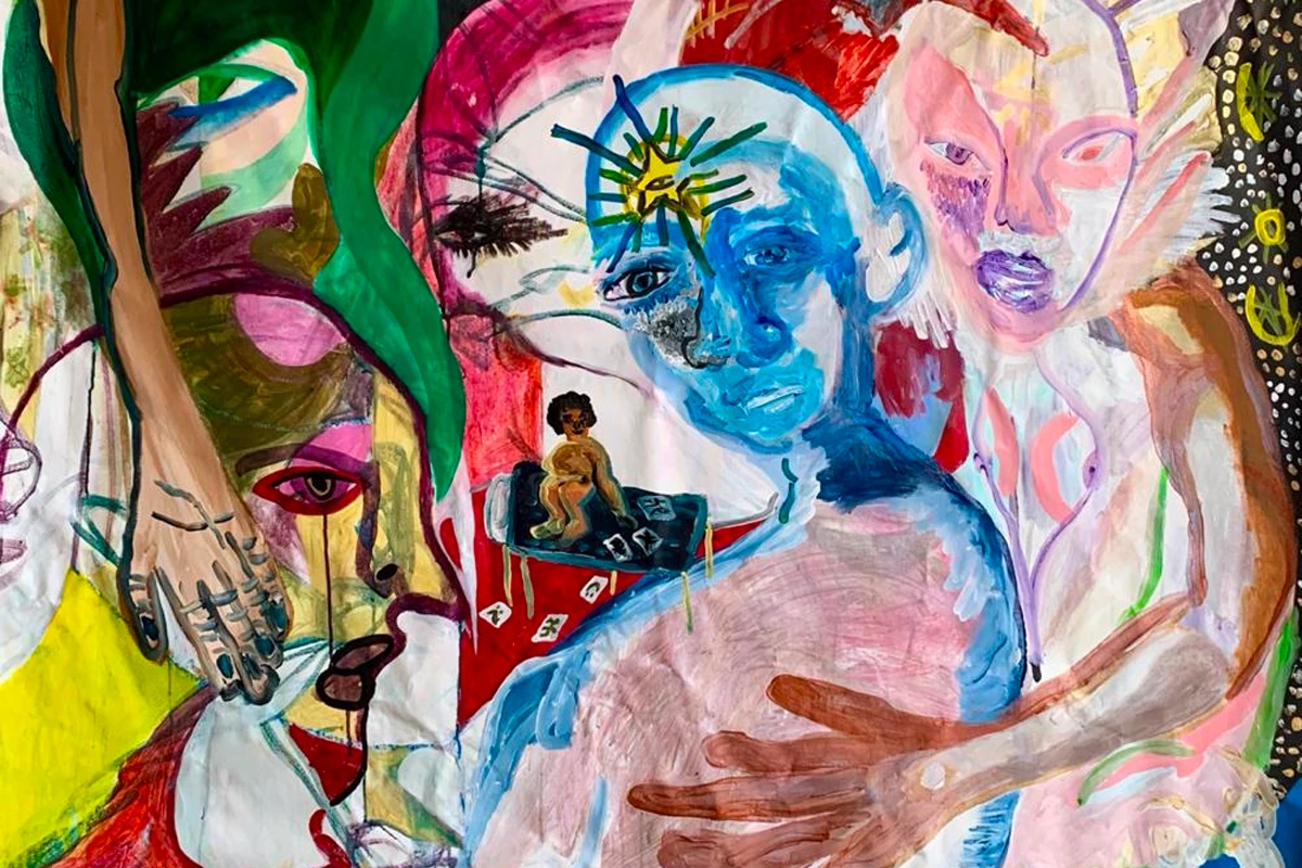 “Nossas ações geram reações em tudo que nos rodeia. O que absorvemos do mundo a partir daí nos possibilita explorar novos caminhos ou permanecer na mesma trilha”, explica Saboia. Esse foi o ponto de partida de Deus em Mim, primeira pintura da série que também dá nome à exposição. Se, durante seus últimos trabalhos, o artista mostrava seu encontro com Deus por meio de símbolos de proteção externos, chamados por ele de guardiões, agora, essa união com o divino acontece dentro de si e desdobra-se em figuras humanas imersas em outras, como uma espécie de matrioska infinita. A reverberação pictórica aparece em uma mistura interessante entre figurativo e abstrato e nos remete à obra do alemão Emil Nolde, que, assim como o artista brasileiro, choca pela vivacidade das cores e a distorção da perspectiva e dos personagens.